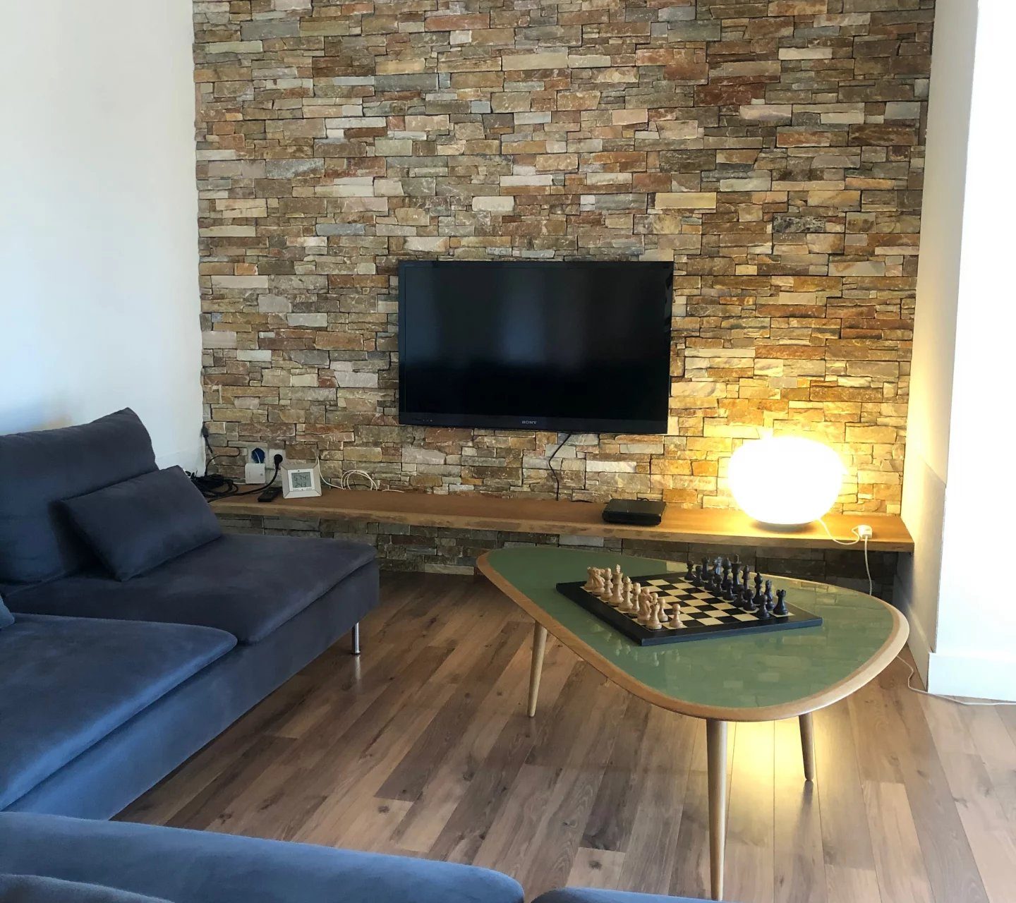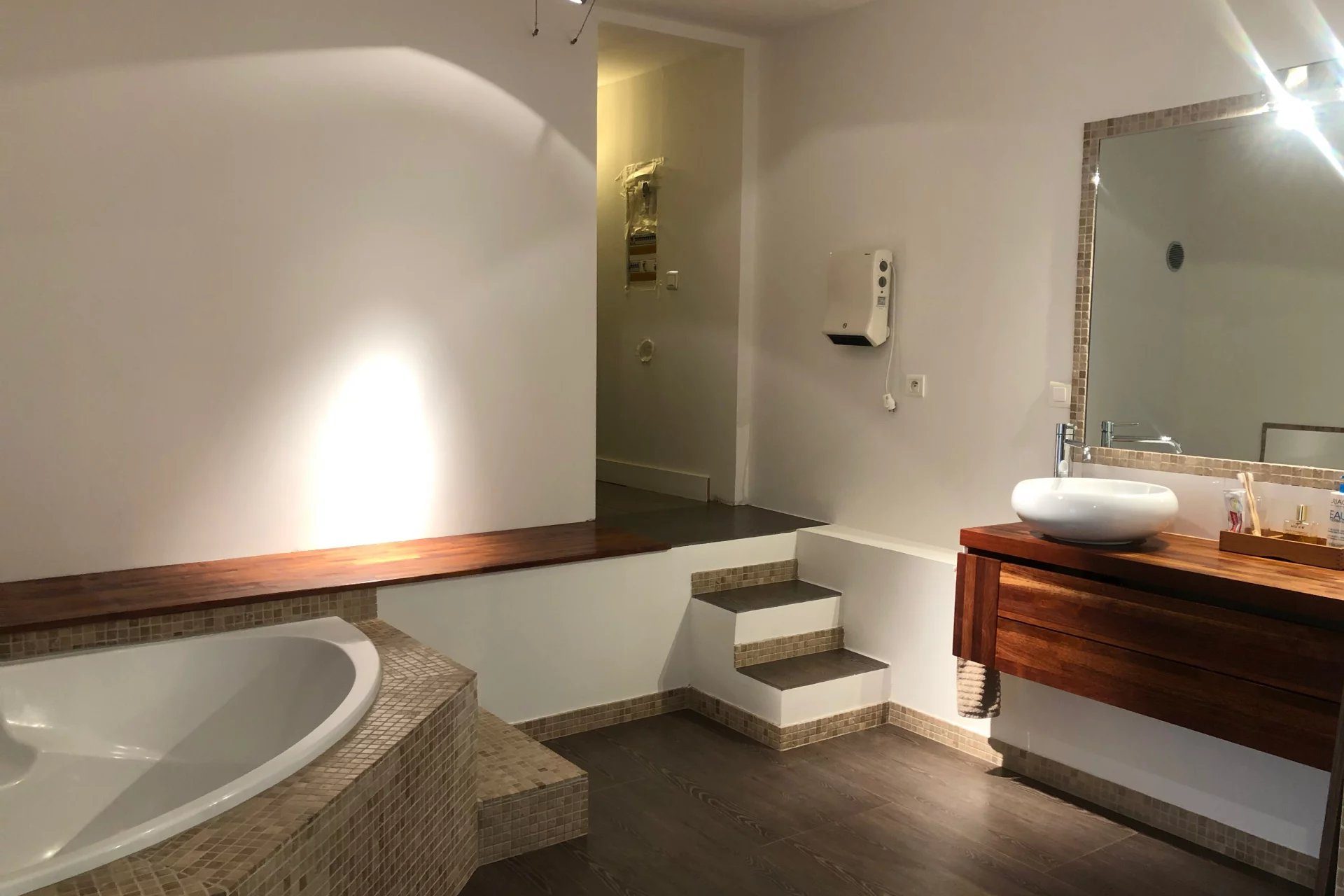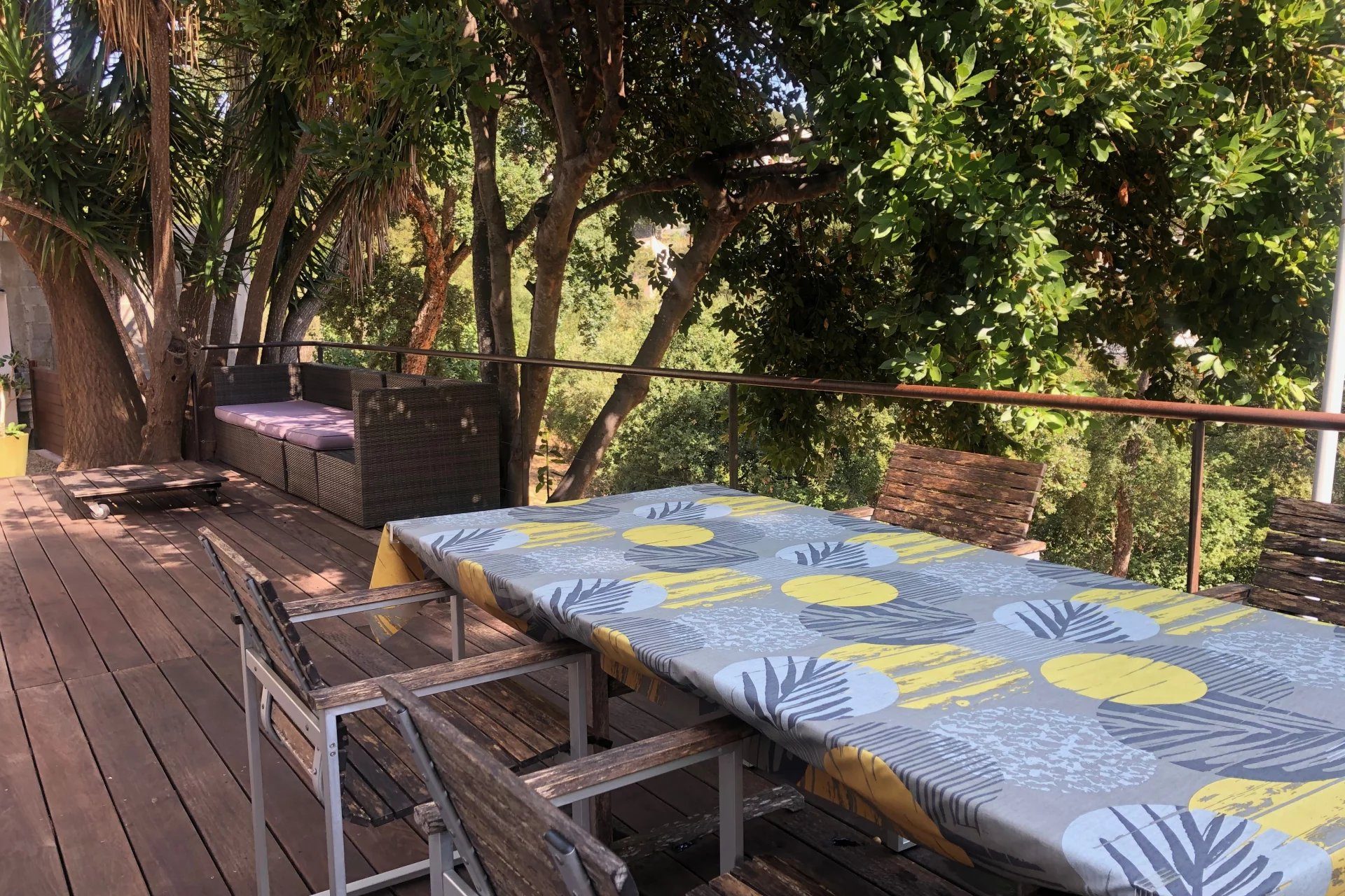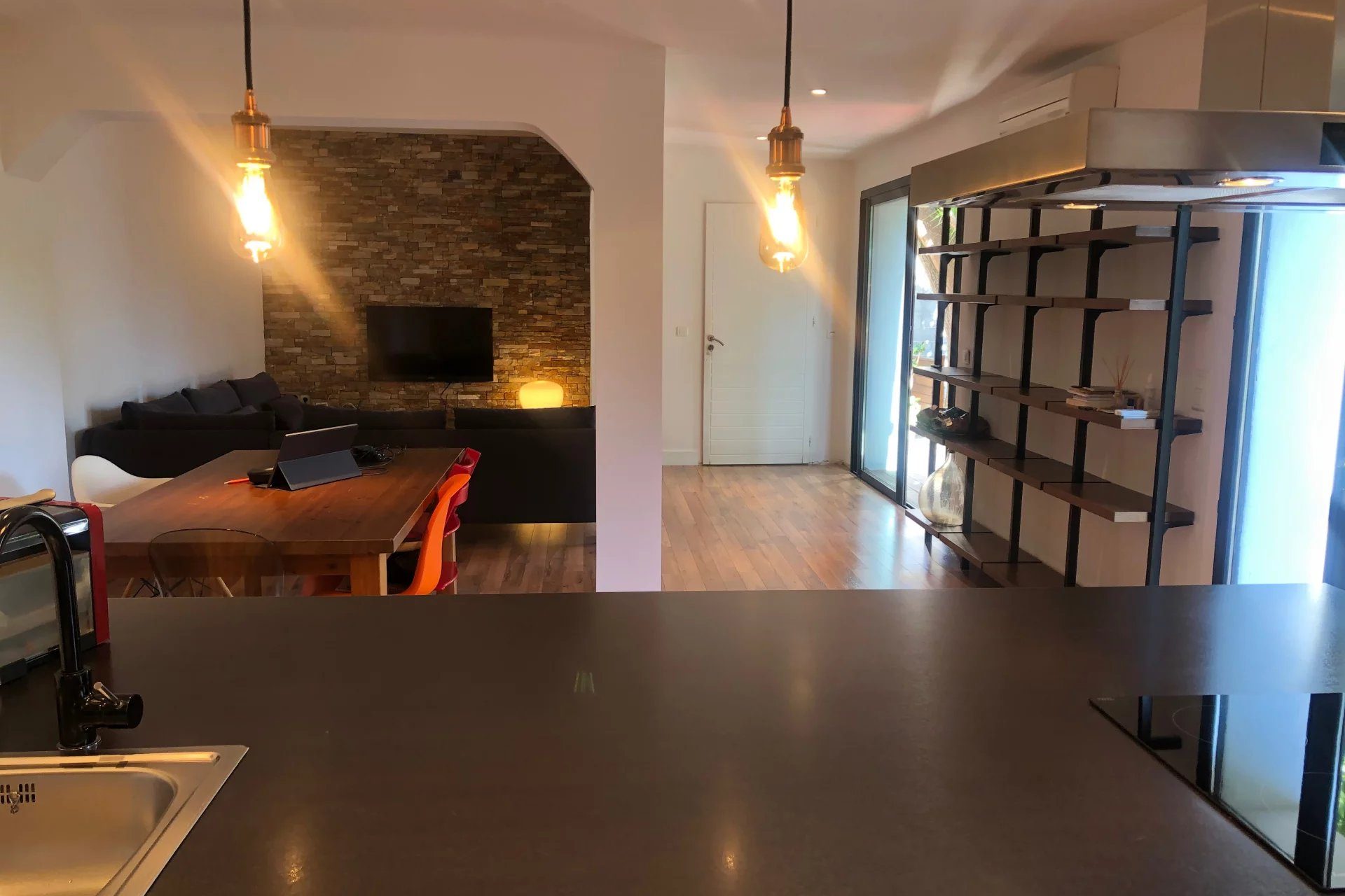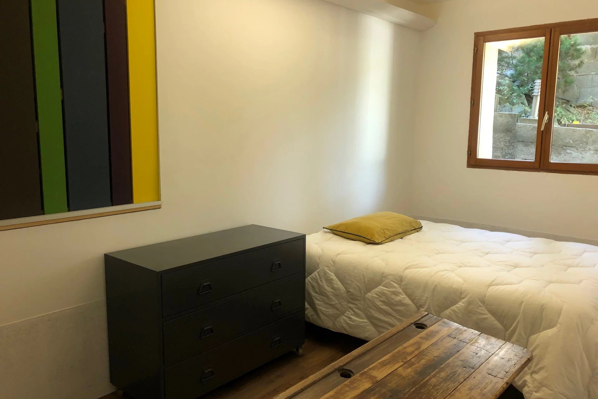 Les collines II, sur les hauteurs de Furiani, Une grande villa divisée en 2 appartements. Nous vous proposons le rez de jardin avec son terrain arboré. Une entrée commune puis un escalier extérieur individuel qui descend vers l’appartement. C’est meublé avec goût, c’est calme et atypique! Deux chambres, un dressing, un salon tv, une mini chambre d’enfant, un séjour avec cuisine ouverte, une salle de bain avec douche et baignoire et une mini buanderie. Les deux terrasses sont agréables et ensoleillées. Le loyer est de 1240 euros/ mois, consommation d’eau incluse. Cet appartement est disponible. Chiens interdits.