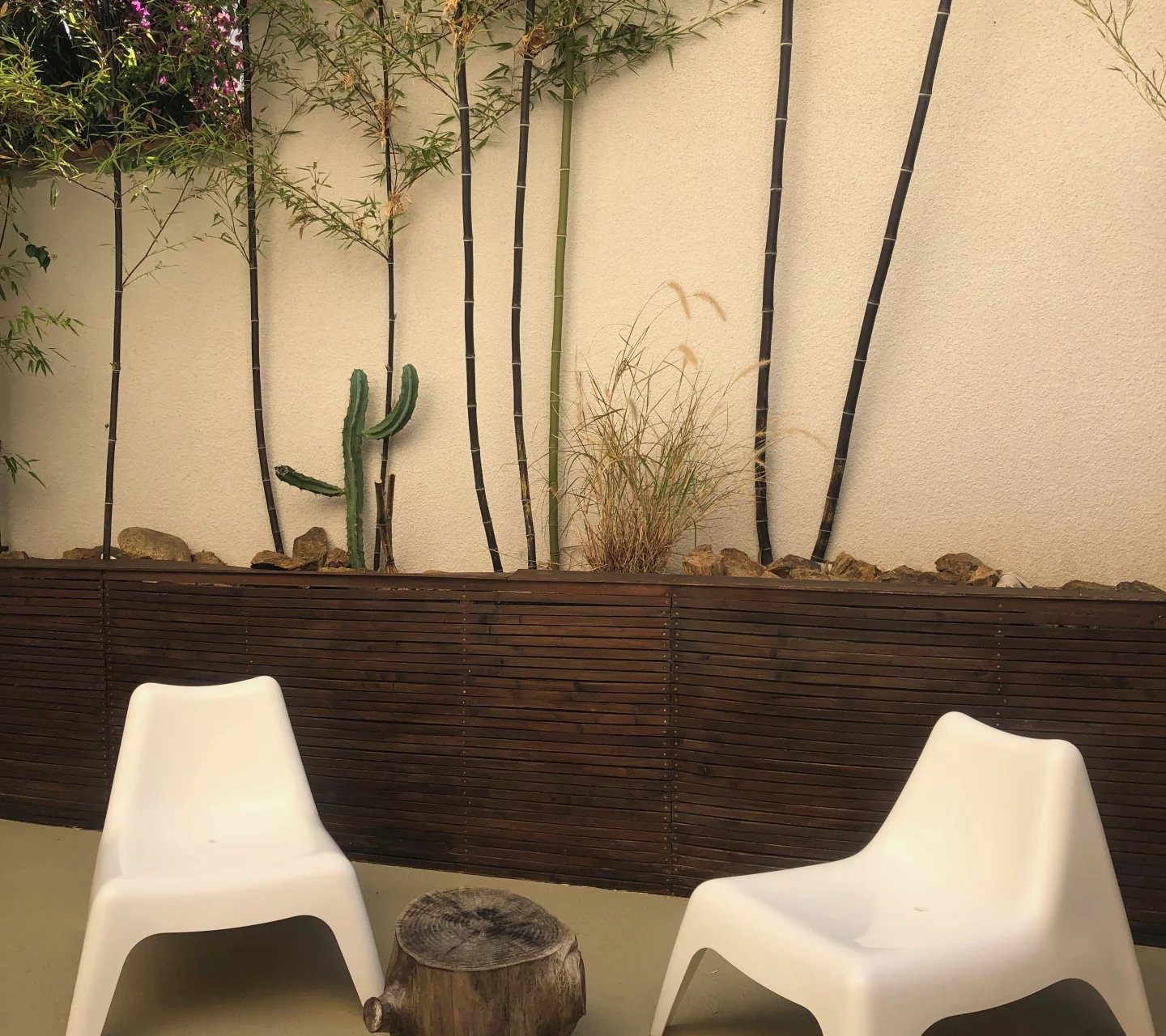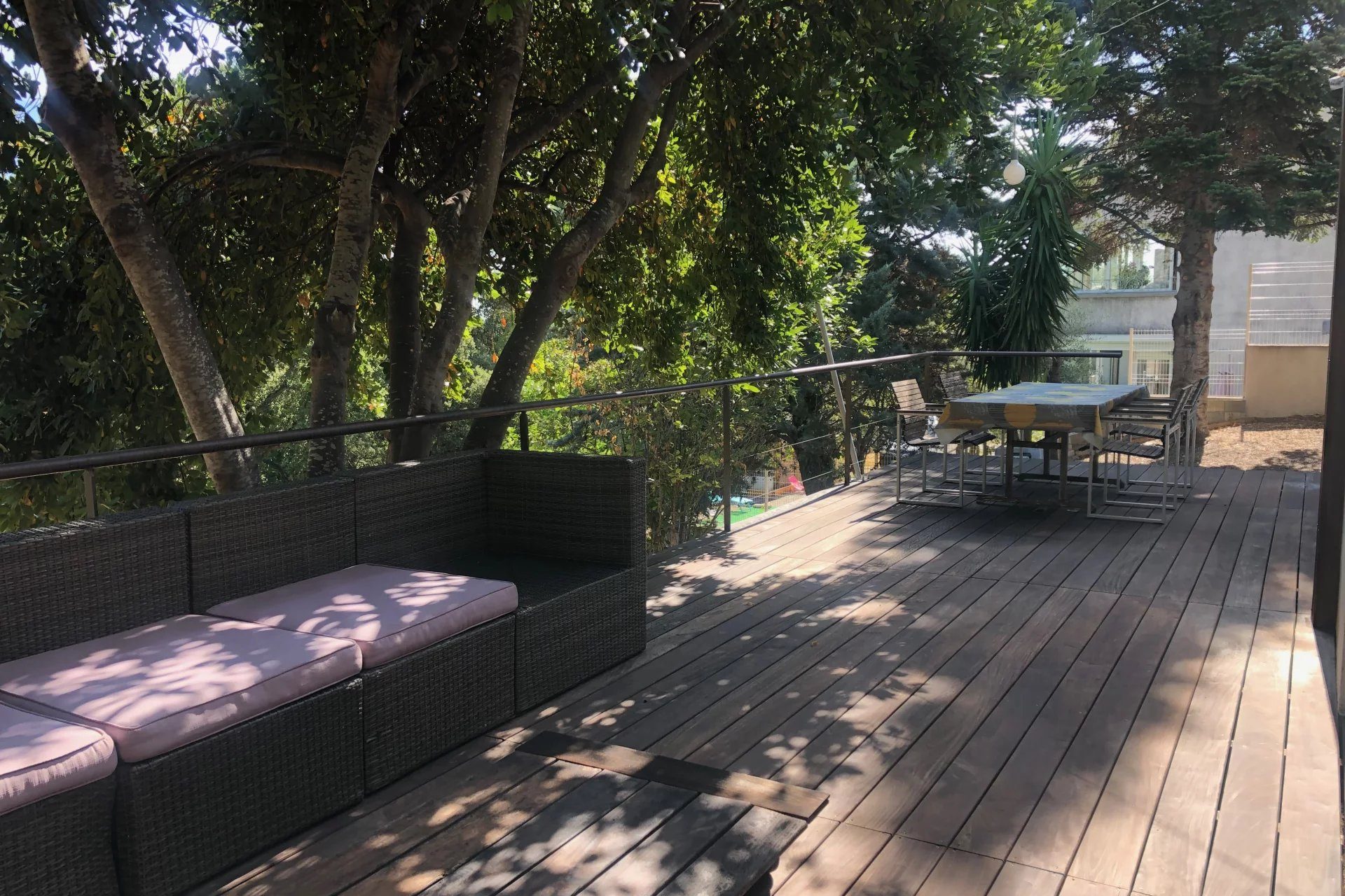 Rez de villa situé au collines à Furiani. un séjour, cuisine équipée, deux chambres et une troisième petite chambre d’enfants. Une salle de bain avec baignoire et douche, wc séparés, deux terrasses avec une jardinet.